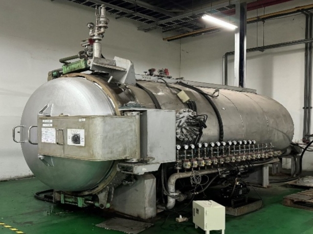 此為本公司碳纖維複合材料產品製造之關鍵製程。於潔淨室環境中完成預浸布疊層與真空袋封裝後,工件移至壓力釜內進行固化。